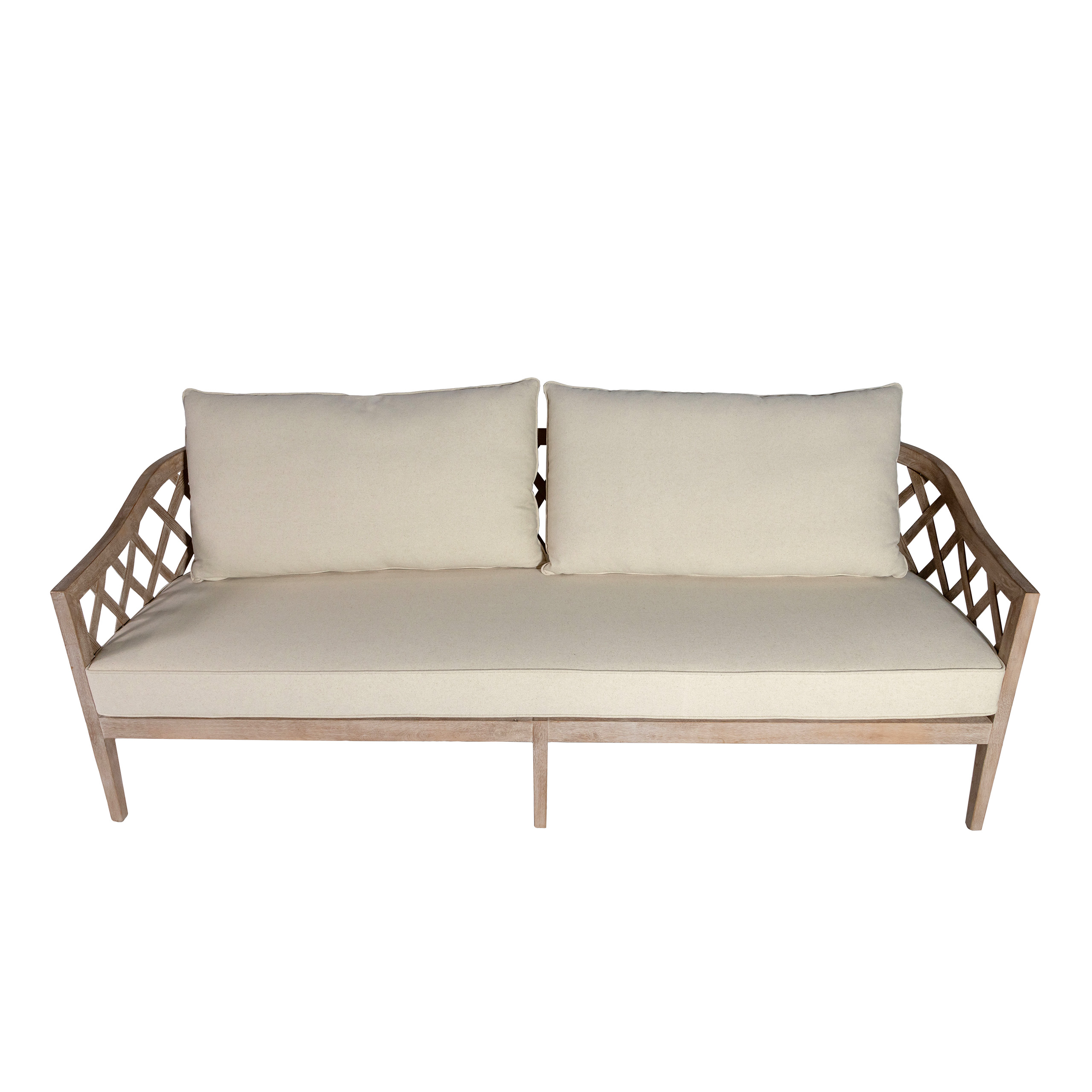 The Ellenwood Sofa-3ppl Ivory from T3 Event Rentals is a stylish 3-seater with an elegant wooden frame, plush ivory cushions, and chic lattice armrests. Shown here from the front against a white background, this rental sofa is available for events in Dawsonville through T3 Event Rentals. Perfect for adding comfort and sophistication to your next gathering!.