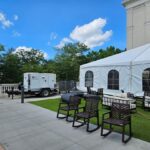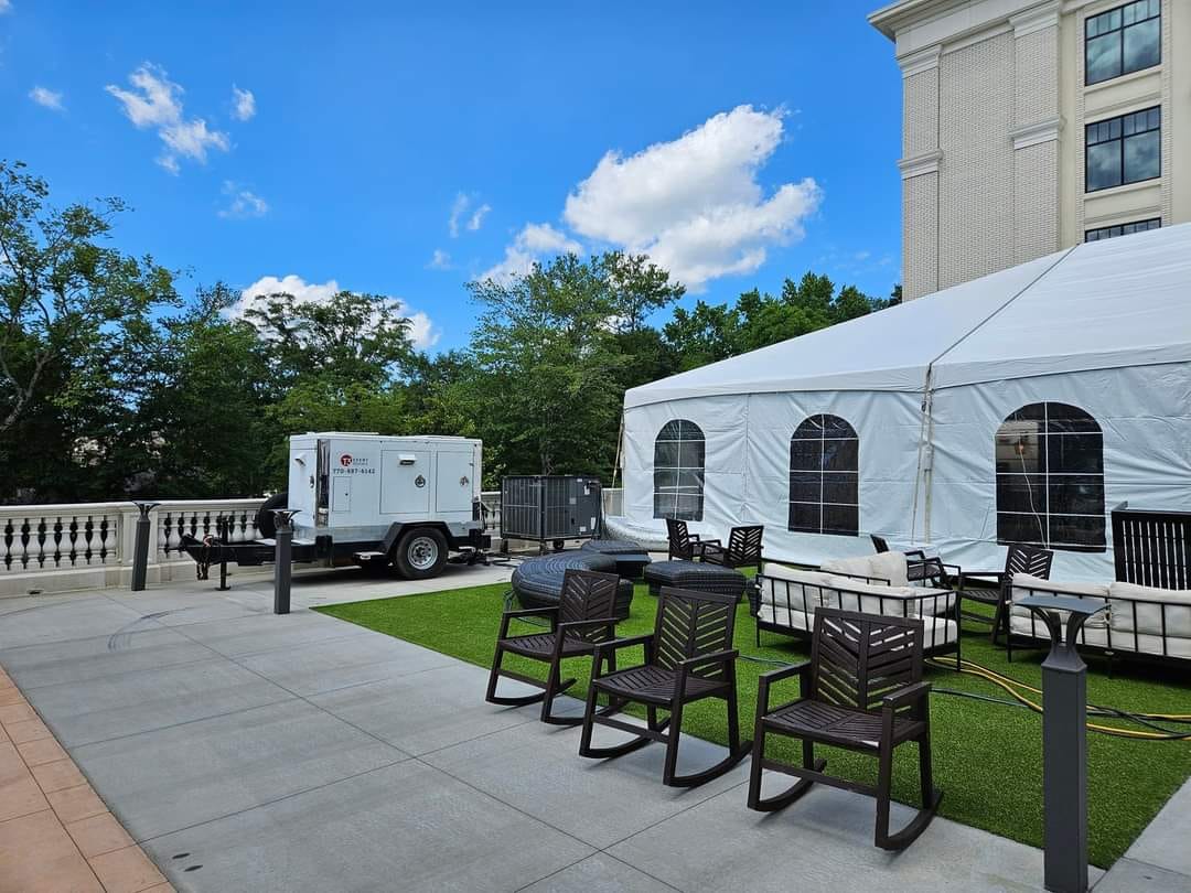 Located in the heart of North Georgia, T3 Event Rentals offers a stunning 40 frame tent equipped with elegant chandeliers, perfect for any upscale occasion. Nestled on a paved surface, this exquisite tent rental features round tables draped in pristine white tablecloths and accented with vibrant yellow runners. Sunlight filters through arched windows, casting a glow on the lush greenery that surrounds it—an impeccable setting for events across Dawsonville and Forsyth County. With T3 Event Rentals based in Alpharetta but serving Atlanta and Dahlonega areas too, you can transform any event into an unforgettable experience with our premium rentals.