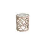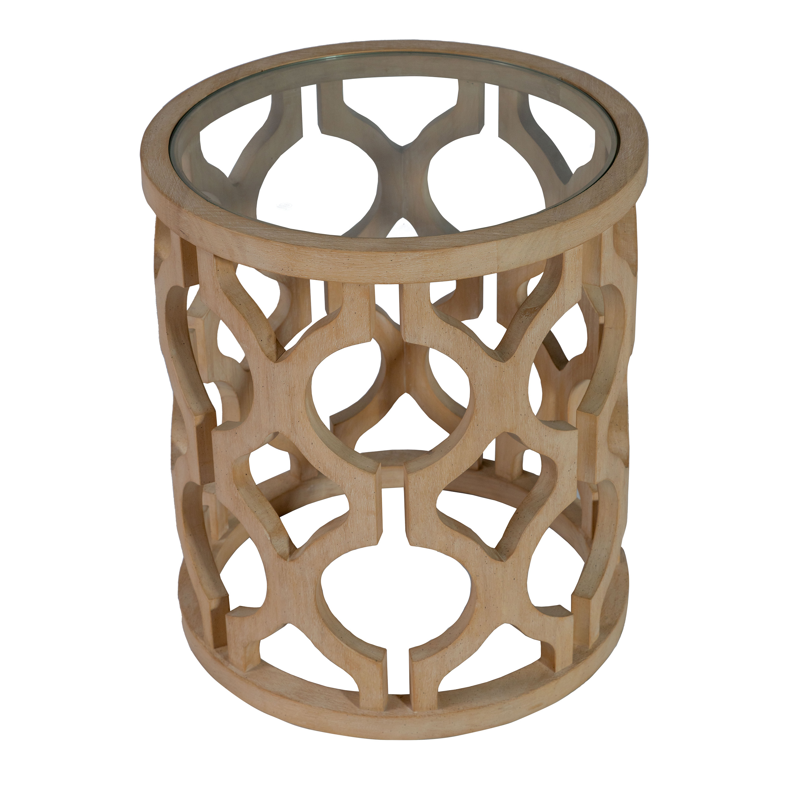The Lenox End Table is a stylish accent piece crafted from natural wood with a laser-cut openwork drum base and a clear glass top. Its round silhouette and intricate geometric design make it an eye-catching addition to lounges, vignettes, or modern rustic event setups. With a diameter of approximately 18 inches and a height of 22 inches, it offers a compact yet functional surface for florals, candles, or beverages without overwhelming your layout.